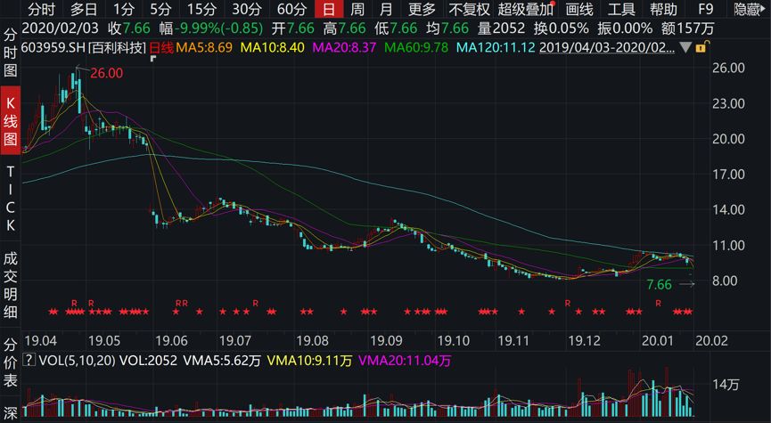 Wind数据显示,1月23日,百利科技一字跌停,股价为8.51元;2月3日,春节后首个交易日,至午盘时,百利科技继续一字跌停,收于7.66元。