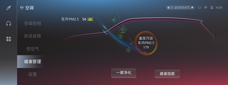 新型冠病毒大多是通过飞沫、粉尘、气溶胶进行传播,车主上车时,在智能健康气候控制系统的联动下,前端的颗粒物传感设备可监测车内、车外空气质量,当监测到污染病毒时,可以智能联动PM0.1高效复合抗病毒过滤器、空调过滤器、紫外线消毒器等设备,形成车内空气治理的闭环,使漂浮在空气中的病毒可以被有效过滤和隔离。整车对体积≥0.3μm的颗粒物过滤效果达到97.7%,优于“N95口罩”级别防护,有效保障车内的空气安全。