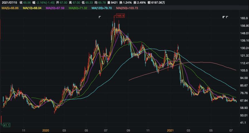 今年上半年,该公司股价在1月22日触达132.42元/股高点,而截至7月15日,小熊电器收盘价为65.56元/股,距股价最高点跌幅达47%。在此期间内,投资者亦换手频频,换手率高达247.16%。