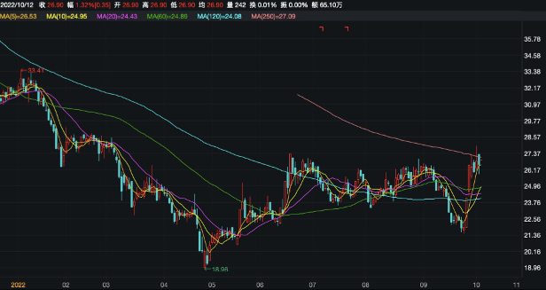 在二级市场,该公司股价从2020年4月创下最高价91.11元/股后一路下跌,于2022年4月27日跌落至18.96元/股低点。此后5个月,该股有所回调,截至10月11日收盘,该股报于26.55元/股,较历史高点已下挫70%,目前市值为106.58亿元。