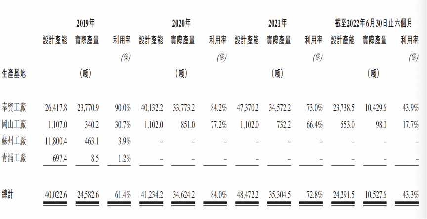 《投资时报》研究员注意到,奉贤工厂2019年至2021年产能利用率分别为90%、84.2%和73%,冈山工厂产能利用率分别为30.7%、77.2%和66.4%。今年上半年,2个工厂的产能利用率急剧下降,奉贤工厂产能利用率为43.9%,冈山工厂仅为17.7%。