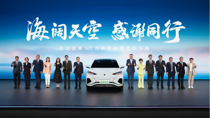 比亚迪成为全球首家达成第500万辆新能源汽车下线的车企,这份成绩属于比亚迪,更属于中国汽车品牌。在一起,才是中国汽车,比亚迪将与同行携手并进,共同打造令人尊敬的世界级品牌,为全球汽车工业变革注入中国汽车力量,以领先科技助力全球实现绿色梦想。