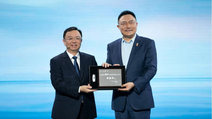 王传福向罗振宇交付比亚迪第500万辆新能源汽车——腾势N7