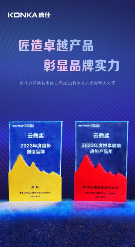 凭借多年来深耕产品、精研品牌的优异表现,康佳白电分别斩获云鼎奖 2023年度悦享健康-产品引领奖与2023年度趋势创造品牌。