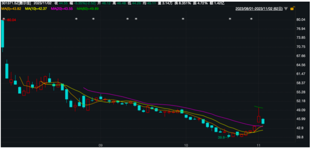 或受业绩下行影响,敷尔佳登陆资本市场后股价呈现触高后持续回落趋势,在8月1日上市当日触及80.04元/股(按前复权计算,下同)高点后,公司股价一路走低。截至11月1日收盘,该公司仅报收于47.07元/股,较此前高点下降近半,与55.68元/股的发行价相比也已经跌去15.46%。