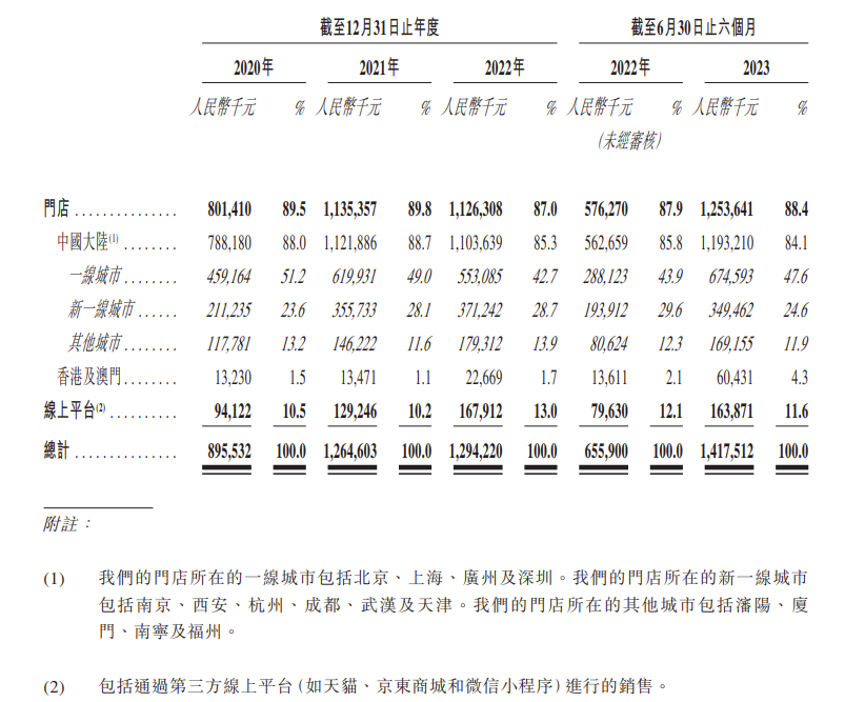 老铺黄金按销售渠道和地理市场划分的收入明细