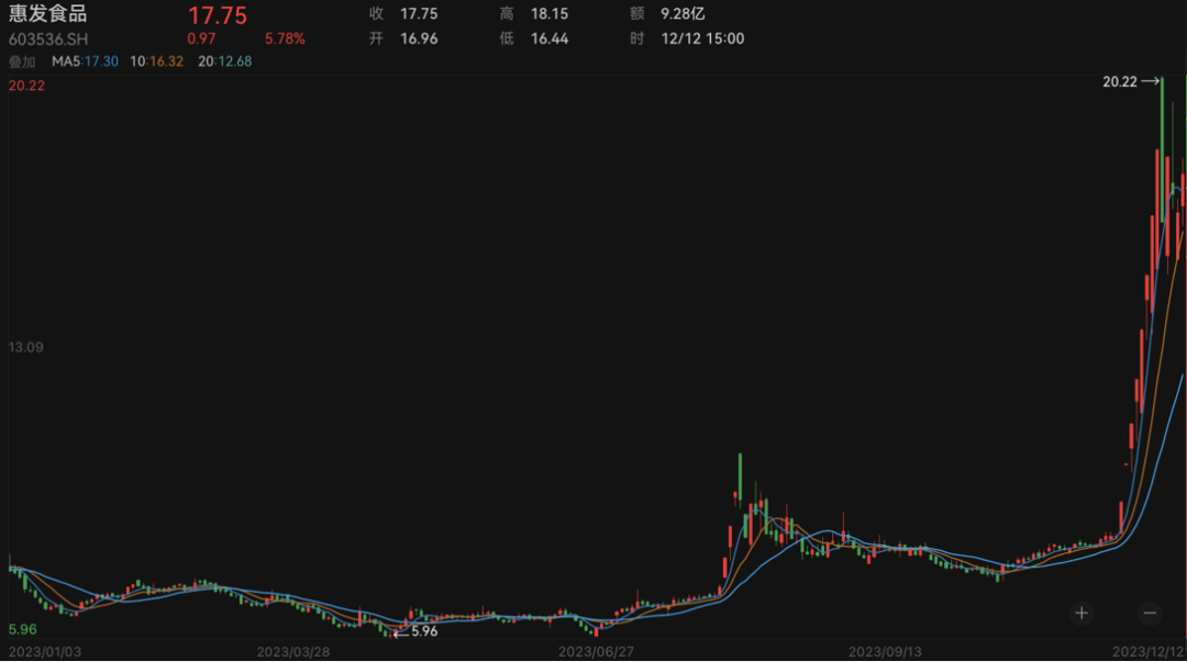 12月6日上午,惠发食品盘中涨停,股价触及20.22元/股(按前复权计算,下同)高点,创下上市以来新高。而在此之前,该股于11月24日至12月5日连续8个交易日收获涨停。不过,12月6日午后,惠发食品股价出现大幅回落,最终以跌停收盘,上演“天地板”行情。12月7日,该股再度涨停,10个交易日内录得9个涨停板,累计涨幅为112.25%。