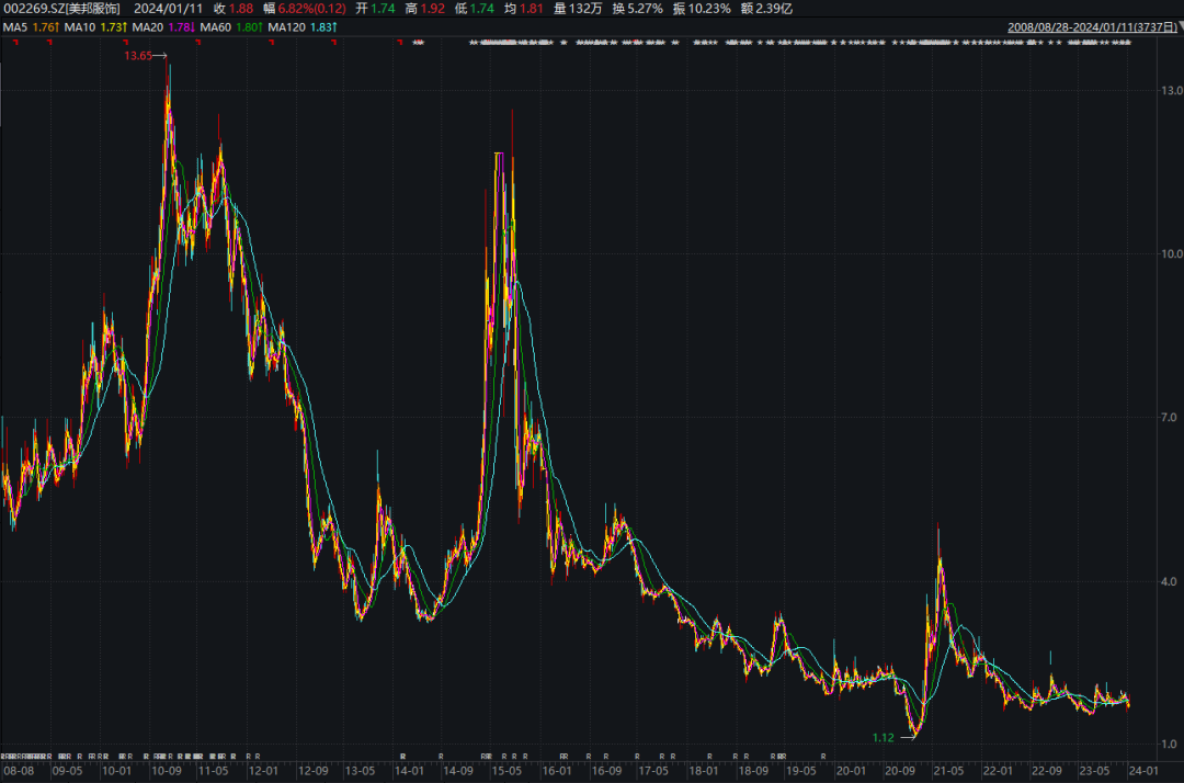 截至1月12日收盘,美邦服饰报收于1.79元/股,当前总市值约为45亿元。