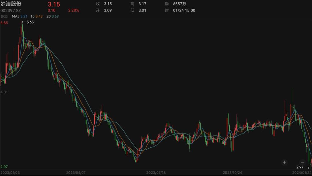 在二级市场,受监管问询、立案调查、行政处罚等一系列消息影响,梦洁股份股价在2022年8月17日达到阶段性高点6.22元/股(前复权)后一路波动向下至今。2024年1月23日,对金森新能源的处罚结果再次打击了投资者的信心,梦洁股份当日盘中股价触及2.97元/股,创下自2022年5月以来新低。截至1月26日收盘,该公司的股价为3.22元/股,年内累计跌幅超27%,市值不足25亿元。