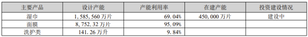 销售走弱的同时,洁雅股份的产能利用率也由过饱和变为不饱和。标点财经研究员整理数据看到,在势头正盛的2021年,洁雅股份两大类主要产品中,湿巾类产品设计产能达149.73亿片,产能利用率高达109.15%;面膜类产品设计产能为6315.84万片,产能利用率达128.78%。