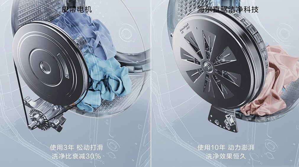 相比之下,海尔直驱洗衣机,让洗衣机告别传统皮带电机,变得安静、平稳,海尔直驱洗衣机能1:1直接驱动内筒,取消皮带传动。除了更平稳安静的优势,还能做到精准控制内筒转动角度和不间断速洗。