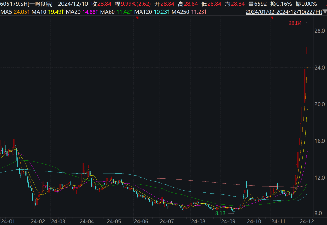 2024年9月后,A股市场整体出现拉升,一鸣食品的股价也随之有所回升,但起初两个月,回升幅度较小,仍徘徊在12元/股以下。直至11月26日开始,一鸣食品股价突然大幅上涨,连收11个涨停板。