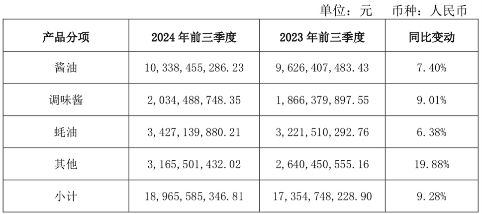 在财报中该公司将上述产品归类为“其他”。2024年前三季度,海天味业“其他”品类收入为31.66亿元,同比增长19.88%,优于酱油、调味酱、蚝油三大业务板块的个位数营收增速。