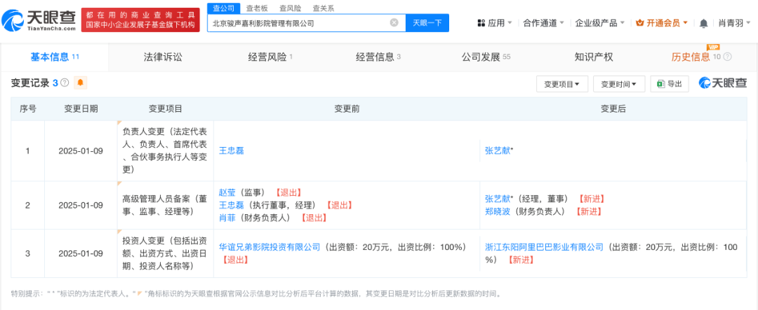 天眼查App显示,近日,北京骏声嘉利影院管理有限公司发生工商变更,原股东华谊兄弟影院投资有限公司退出,新增浙江东阳阿里巴巴影业有限公司全资持股,同时多位主要人员均发生变更。