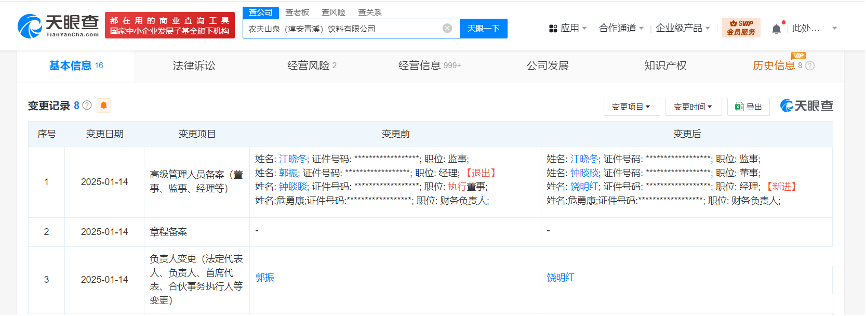 天眼查App显示,近日,农夫山泉(淳安青溪)饮料有限公司发生工商变更,郭振卸任法定代表人、经理,由饶明红接任,钟睒睒由执行董事变更为董事。