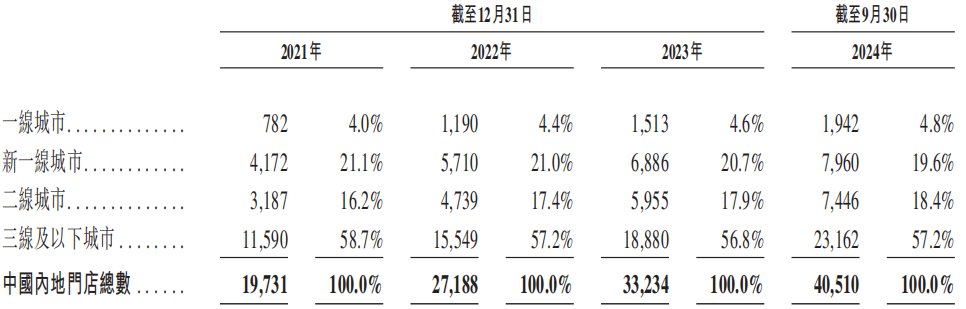 蜜雪冰城业绩增长背后离不开下沉市场带来的巨大红利。截至2024年9月30日,该公司57.2%的中国内地门店位于三线及以下城市。以2023年末门店数计,在市场前五大品牌中,蜜雪冰城在三线及以下城市的渗透率最高,为1.71万家,超过第二名至第五名之和。