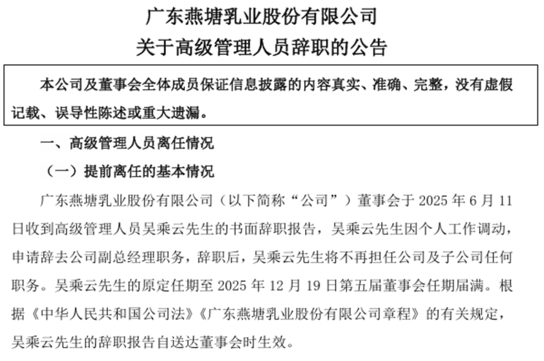 燕塘乳业公告显示,原定于2025年12月19日任期届满的吴乘云,因个人工作调动辞去公司副总经理职务。投资时间网、标点财经研究员注意到,近年来,已有多位燕塘乳业的核心高管相继离职。