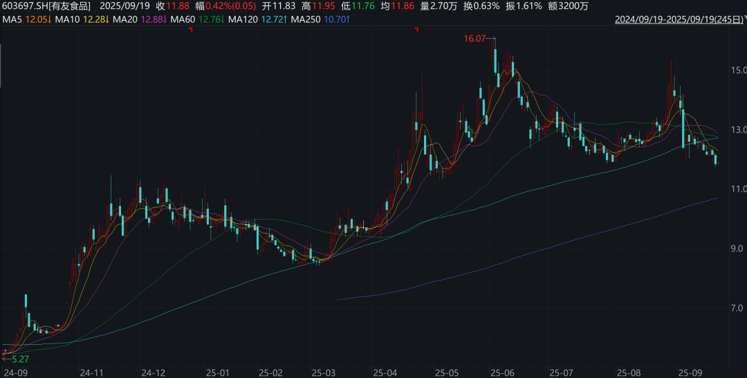 或受实控人减持影响,有友食品股价此后有所回调。截至9月19日午盘,该股报11.91元/股,总市值约为51亿元。