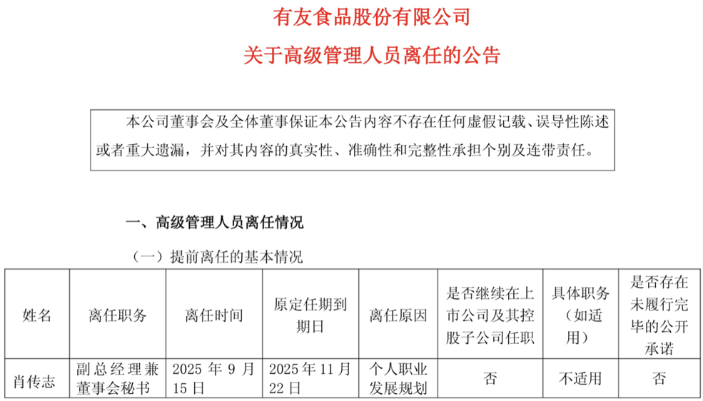 有友食品发布高级管理人员离任公告