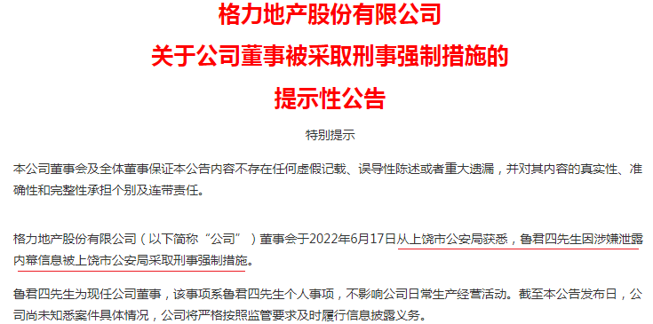 格力地产公告董事被采取刑事强制措施