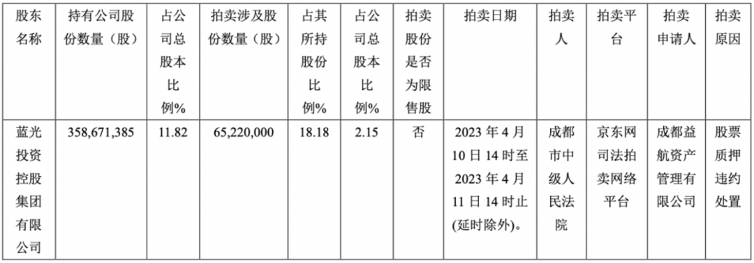 此前一天,蓝光发展发布公告称,截至2023年4月7日,公司控股股东蓝光集团持有公司股份3.59亿股,占公司总股本的11.82%。上述流拍的6522万股,占公司总股本的2.15%。