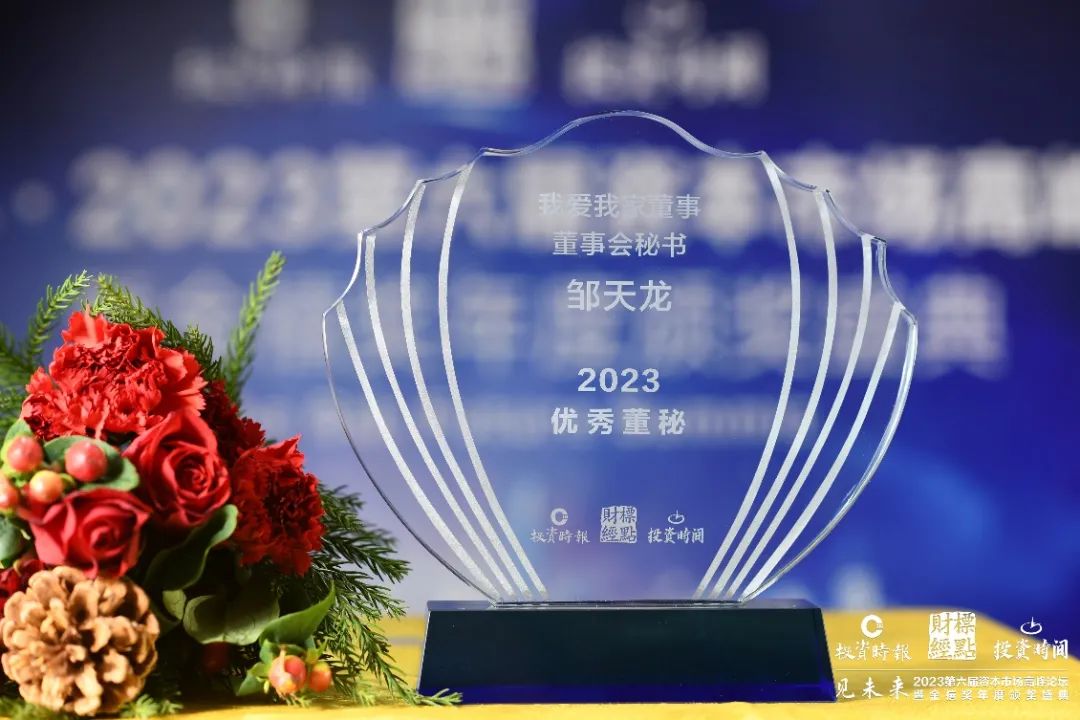 2018年起,《投资时报》携手标点财经研究院创设“金禧奖”,以传播榜样的力量。多年积累的优势及影响力使得“金禧奖”的权威性广受各界认可。经过激烈的竞争与遴选,一批引领行业未来趋势、敢于突破和创新、经营业绩出色并对社会有突出贡献的企业及个人脱颖而出,获得了褒奖。其中,我爱我家董事、董事会秘书邹天龙就喜获“2023优秀董秘”奖项。