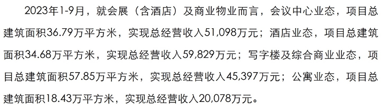 得益于上述推进发展,北辰实业会展(含酒店)及商业物业板块表现较优。数据披露,2023年前三季度,该公司会议中心、酒店、写字楼及综合商业、公寓四大业态分别实现收入5.11亿元、5.98亿元、4.54亿元和2.01亿元。与上年同期数据相比,该公司除写字楼业态经营收入下降外,板块内会议中心、酒店、公寓业态总经营收入均较上年同期实现增长。