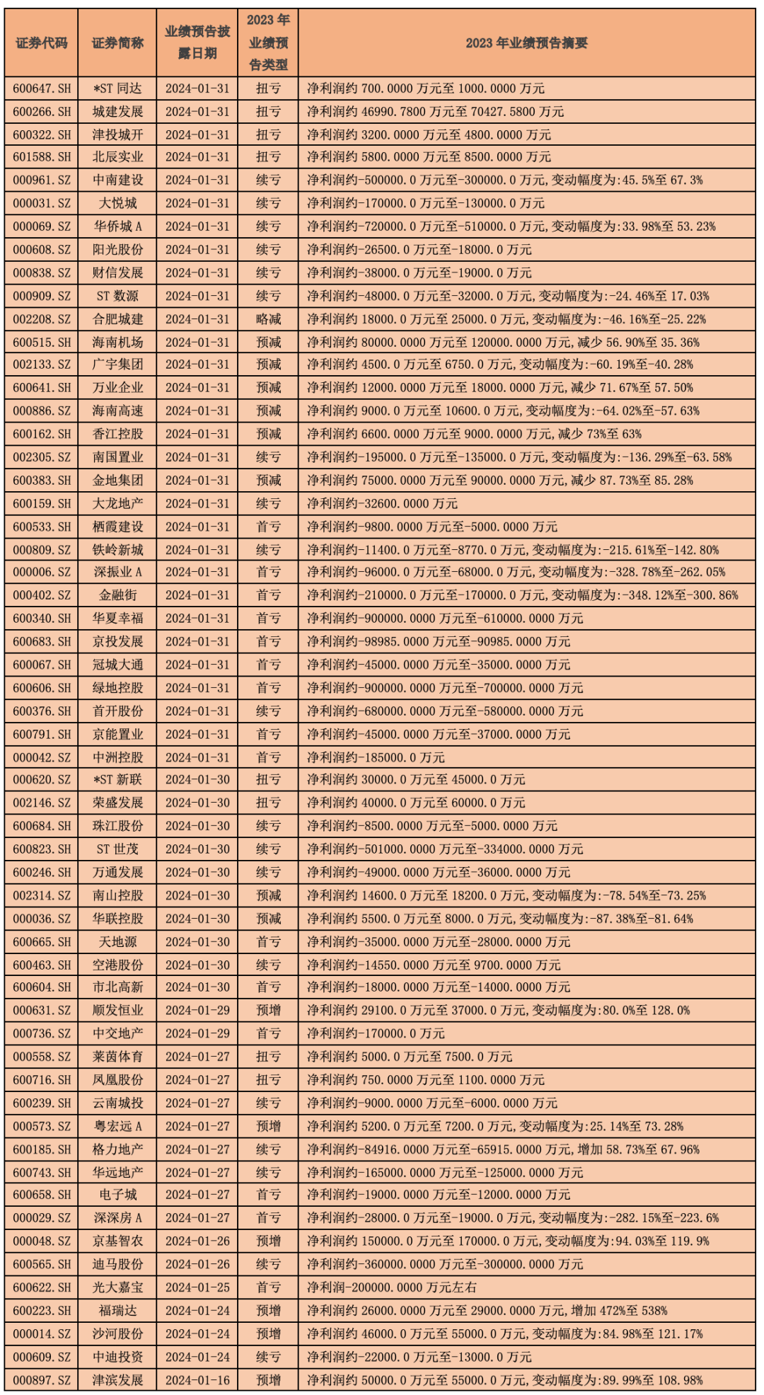 从1月以来发布业绩预告的房企来看,上市房企2023年业绩普遍不佳。