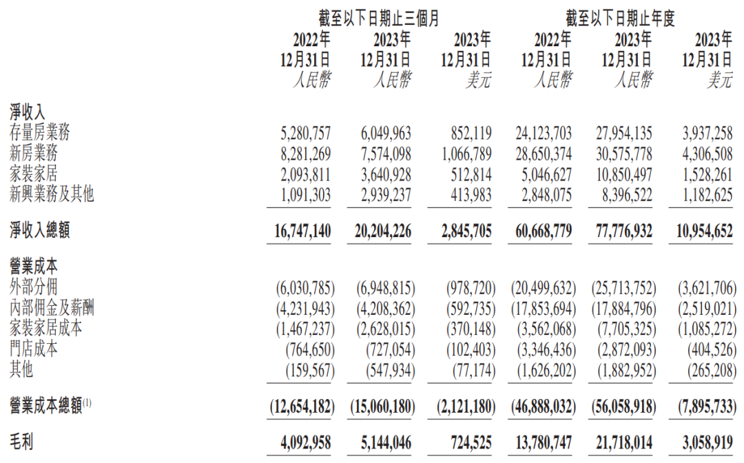 贝壳2023年第四季度及全年主要业绩表现(千元)