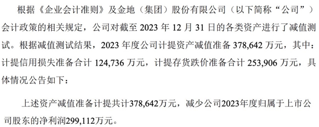 2023年,金地集团共计提资产减值准备37.86亿元,导致该公司同年归母净利润减少29.91亿元