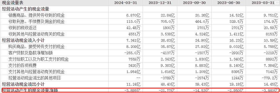 业绩下滑令南京高科的现金流持续承压。财报显示,2023年以来,该公司经营性现金流净额持续为负。截至2024年第一季度末,南京高科经营活动产生的现金流净额为-3.90亿元。同期,公司货币资金为10.92亿元,不足以覆盖48.53亿元的短期借款及11.61亿元的一年内到期的非流动负债。