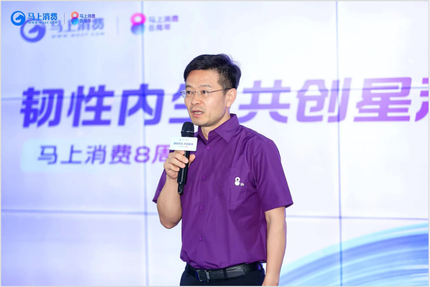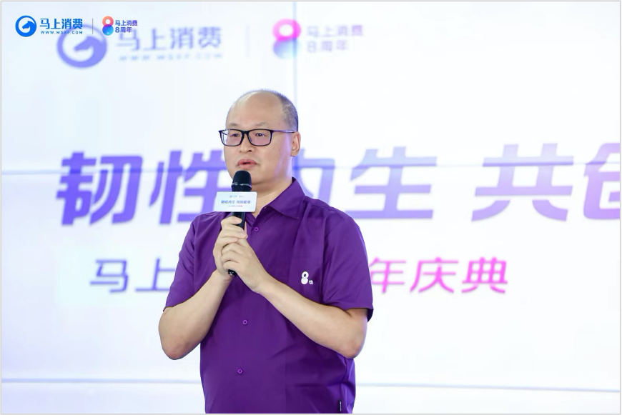 马上消费董事长赵国庆在8周年司庆仪式上讲话。