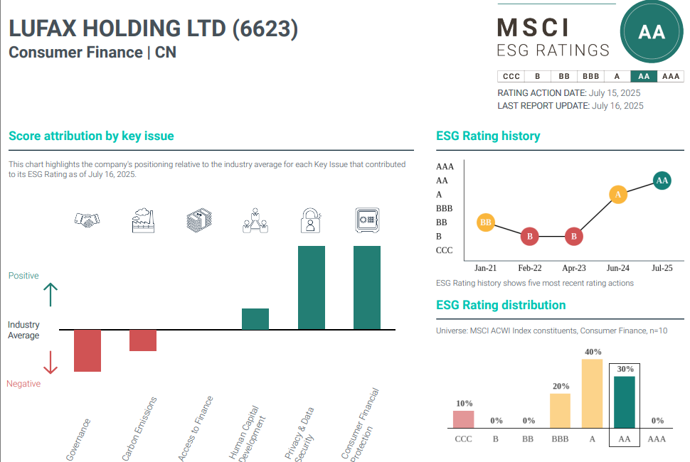 7月16日,MSCI(明晟)将陆控ESG评级由A调升至AA。MSCI作为全球知名ESG评级机构,以严格遴选与高评估标准著称。其评级报告显示,陆控在消费者权益保护方面表现大幅提升,并在隐私与数据安全、人力资本发展等重要议题的表现优于行业平均水平。
