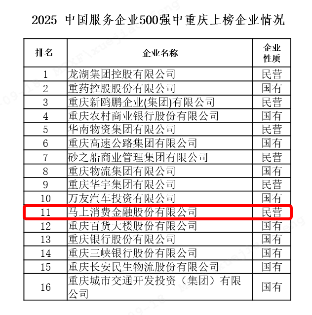 重庆作为我国中西部地区唯一的直辖市,是新时代西部大开发的战略支点、内陆开放的综合枢纽,更是国家服务业扩大开放的综合试点城市。根据大会公布的2025中国服务业企业500强榜单,共有16家渝企上榜。来自重庆的马上消费作为数字金融领域的杰出代表,连续七年入选本次榜单——这不仅是对其经营质量与科技实力的高度认可,也是一家企业与国家战略、行业变革同频共振的生动注脚。