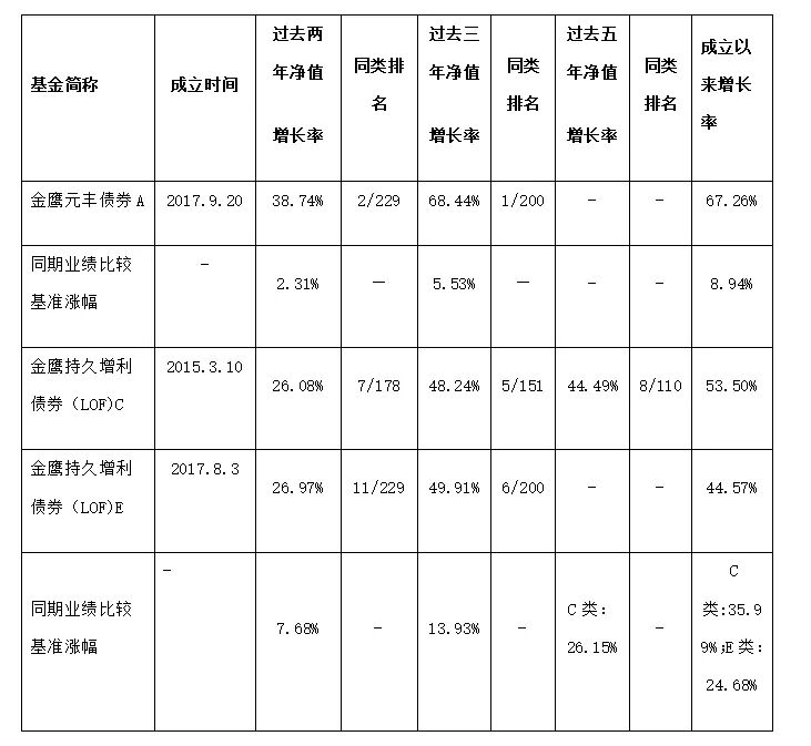 银河证券数据显示,截至6月10日,金鹰元丰债券A近两年、近三年收益率在同类基金中均排在前三;金鹰持久增利债券(LOF)C近两年、近三年、近五年收益率在同类基金中都在前十。