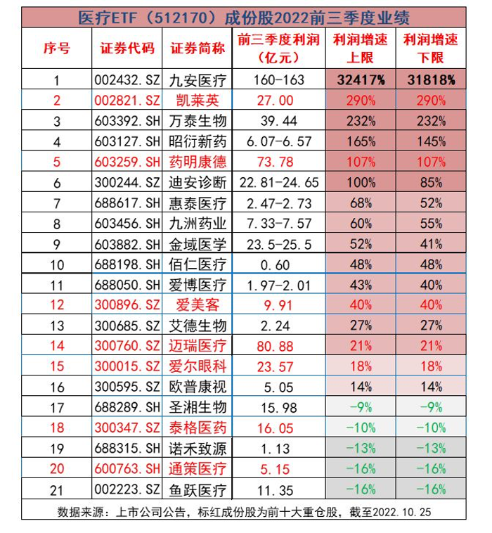 消息面上,昨日盘后多只医疗白马股发布三季报,显著超市场预期。强劲的业绩支撑了股价,今日医疗白马股股价悉数飙升。从医疗板块业绩来看,最新数据显示,中证医疗指数目前共有21家公司发布三季报业绩预告,其中21家公司均实现盈利,16家同比增速为正,占比高达76%,“妖股”九安医疗前三季业绩创纪录的超160亿元,增速超318倍,成为两市名副其实的“深水炸弹”,在A股医药生物板块中已披露三季报预告的公司中,九安医疗净利润增速位列第一。
