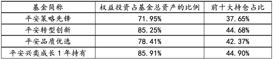 从披露的股票投资持仓来看,神爱前管理的4只基金在三季度权益仓位略微下调,但依然维持高仓位运作。截至三季度末,平安策略先锋、平安转型创新、平安品质优选、平安兴奕成长一年持有权益投资占比分别为71.95%、85.25%、78.41%、85.91%。
