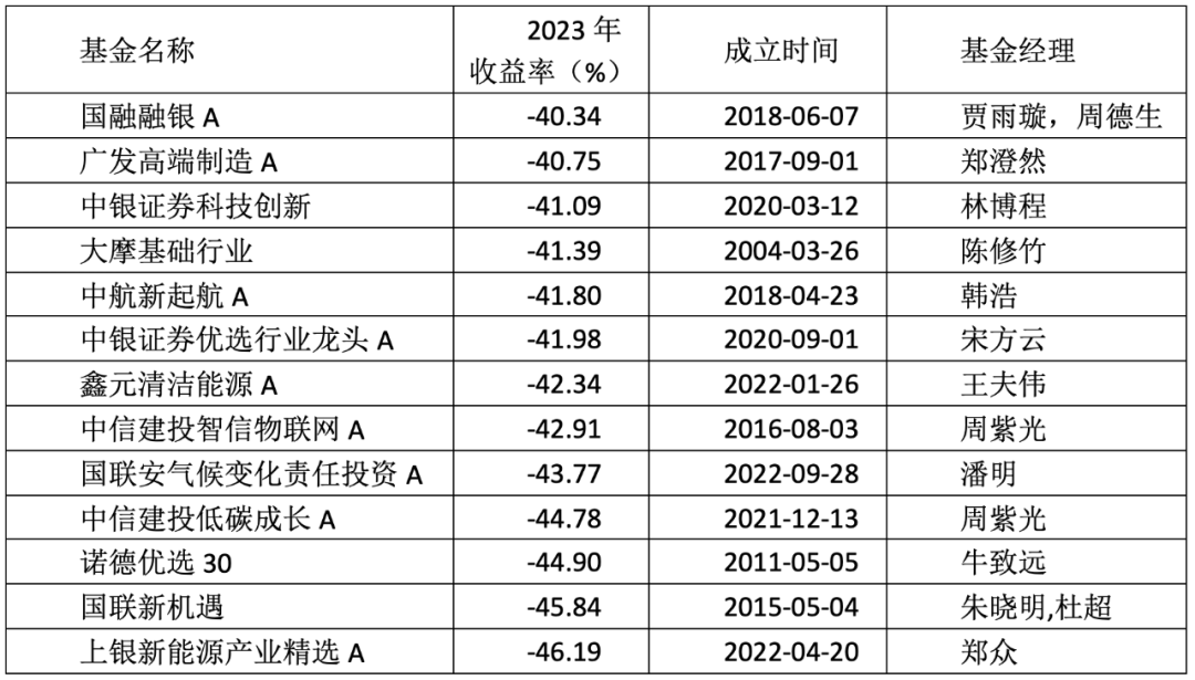 另一方面,有13只主动权益类基金2023年净值跌幅超过40%。具体来看,上银新能源产业精选A以-46.19%的收益率居主动权益类基金倒数第一名,国联新机遇、诺德优选30在2023年的收益率分别为-45.84%、-44.9%,在主动权益类基金中排在倒数第二名、倒数第三名。