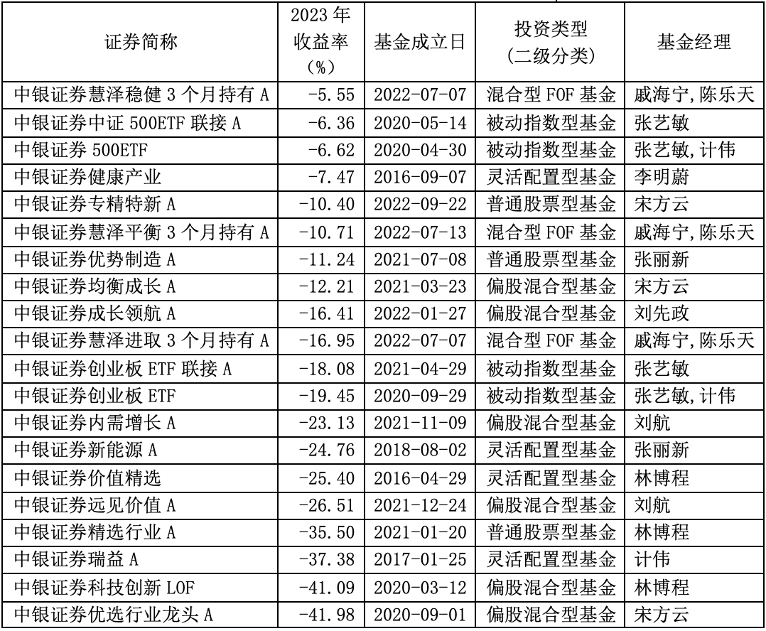 中银证券有20只权益类基金能获得2023年收益率,收益率全部告负。其中,有两只基金净值跌超40%