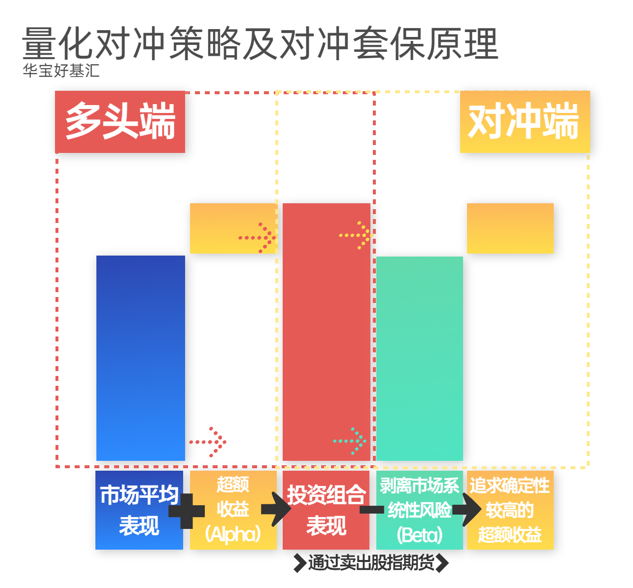 产品是否适合,首先从投资者的风险偏好和配置需求开始考虑。量化对冲的投资策略是一类特殊的绝对收益策略,它跟传统的债券组合为主的绝对收益策略不同,而是由“股票多头端”和“对冲空头端”两部分构成,就是在买入股票现货的同时,卖出相应的股指期货合约。通过卖出股指期货,将现货部分的系统性风险(Beta)剥离,因此整体组合基本不受市场大幅波动的影响,在一定程度上构建了一个“市场中性”组合。