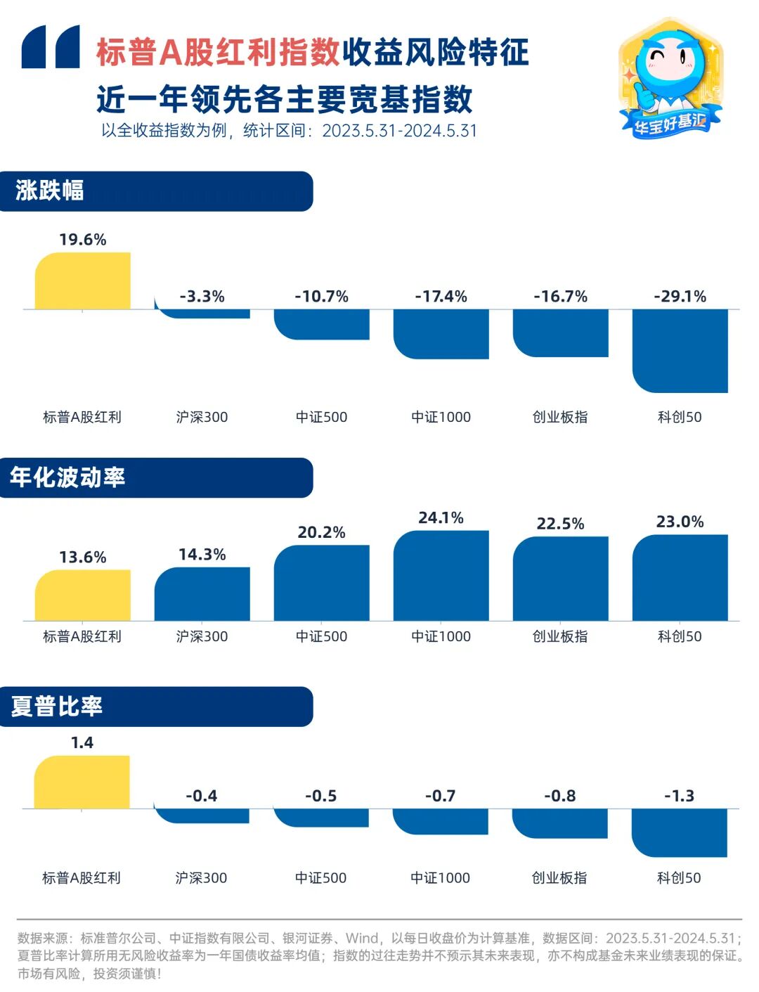 在过去一年中,“红利策略”收益一路走高,成为许多投资者的“香饽饽”。例如标普A股红利指数,其全收益指数在过去一年中(2023.5.31-2024.5.31),实现了19.6%的涨幅,年化波动率仅为13.6%。相比起沪深300、中证500等沪深主流宽基指数,其表现也相当出色。