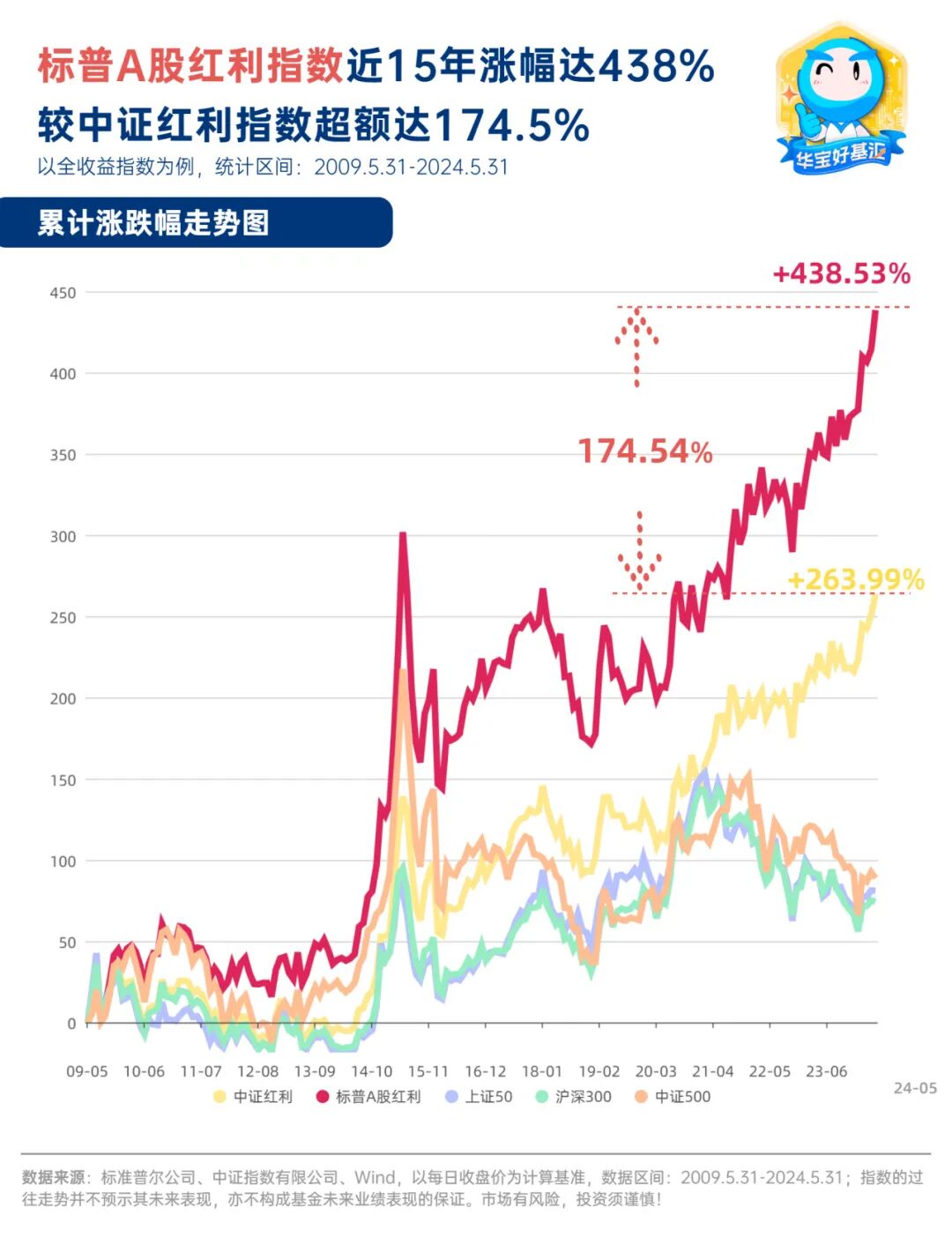 定投是个小事,是每个月从钱包中挤出一些“零钱”的小事;但它又是一件大事,它需要我们长时间的坚持,短短一两年时间难以得到惊人的效果。不少小伙伴也在畅想能在40岁,乃至在35岁前提前退休,那我们以定投15年的跨度举例吧:在过去的15年中,中国股市风雨兼程,蓬勃生长。不同时期的市场也曾由不同的风格主导,而细数下来,红利策略仍是独树一帜。在全收益口径下,截至2024.5.31,标普A股红利指数达438.53%,大幅超越上证50、沪深300、中证500等“老牌”宽基指数。红利策略穿越A股牛熊,更彰显长期价值。