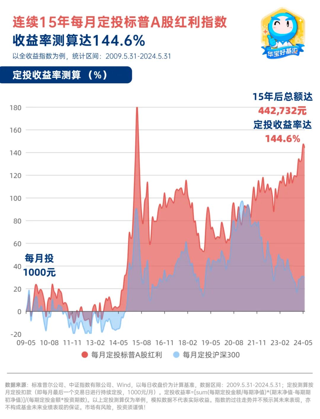假设从2009年5月开始,每月末投资1000元标普A股红利指数,在2024年5月末将收获442732元的投资总额,收益率达144.6%。积少成多,每天省下一杯咖啡的钱,总有一天能给你带来大惊喜。