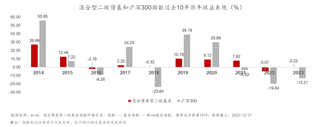 从过去10年中每个自然年度区间来看,混合债券型二级基金指数相对沪深300的收益波动更小,在2016、2018、2021、2022及2023沪深300指数为负收益的年份中,混合债券型二级基金指数表现相对亮眼。