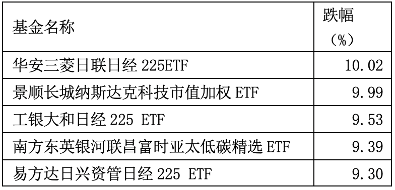 根据Wind数据,8月5日,华安三菱日联日经225ETF、景顺长城纳斯达克科技市值加权ETF、工银大和日经225 ETF、南方东英银河联昌富时亚太低碳精选ETF、易方达日兴资管日经225 ETF场内跌幅均超过9%。