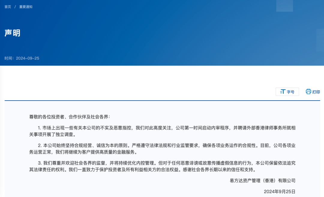 针对上述内容,易方达香港发布声明称:“市场上出现一些有关本公司的不实及恶意指控,我们高度关注,公司第一时间启动内审程序,并聘请外部香港律师事务所就相关事项开展了独立调查。”