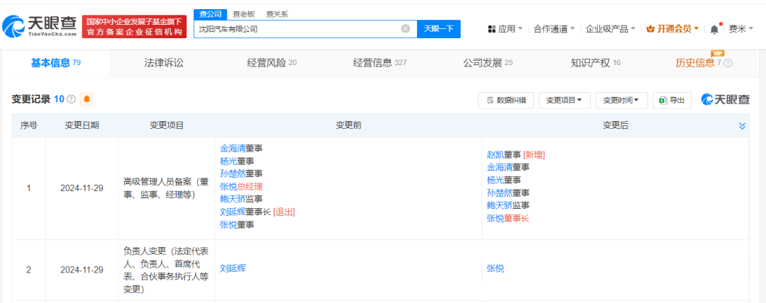 天眼查App显示,近日,沈阳汽车有限公司发生工商变更,刘延辉卸任法定代表人、董事长,由张悦接任,同时张悦卸任总经理职位。