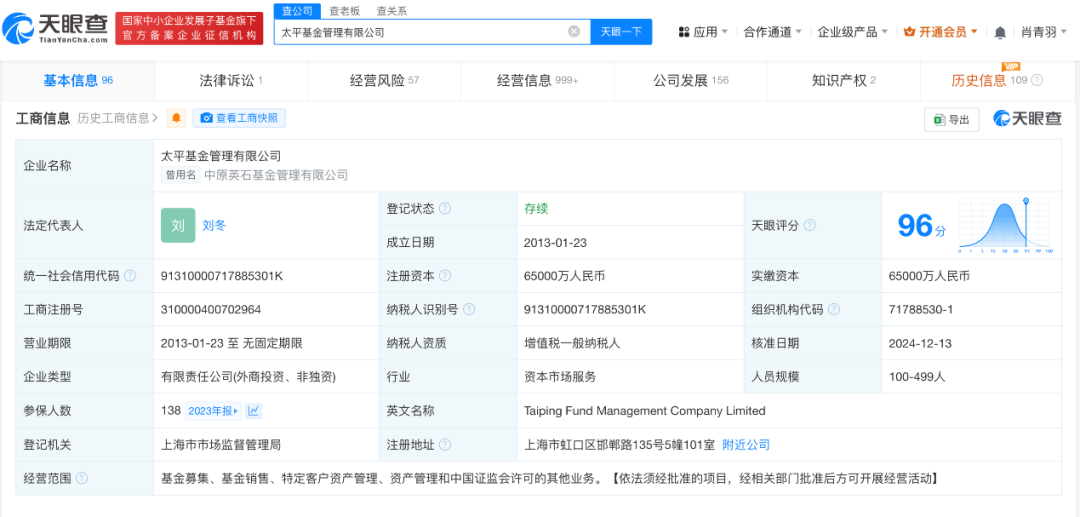该公司成立于2013年1月,注册资本6.5亿人民币,经营范围含基金募集、基金销售、特定客户资产管理、资产管理和中国证监会许可的其他业务,由太平资产管理有限公司、太平人寿保险有限公司、安石投资管理有限公司共同持股。此前,太平基金发布公告称,因工作调整,焦艳军离任董事长职务,由刘冬接任该职务。