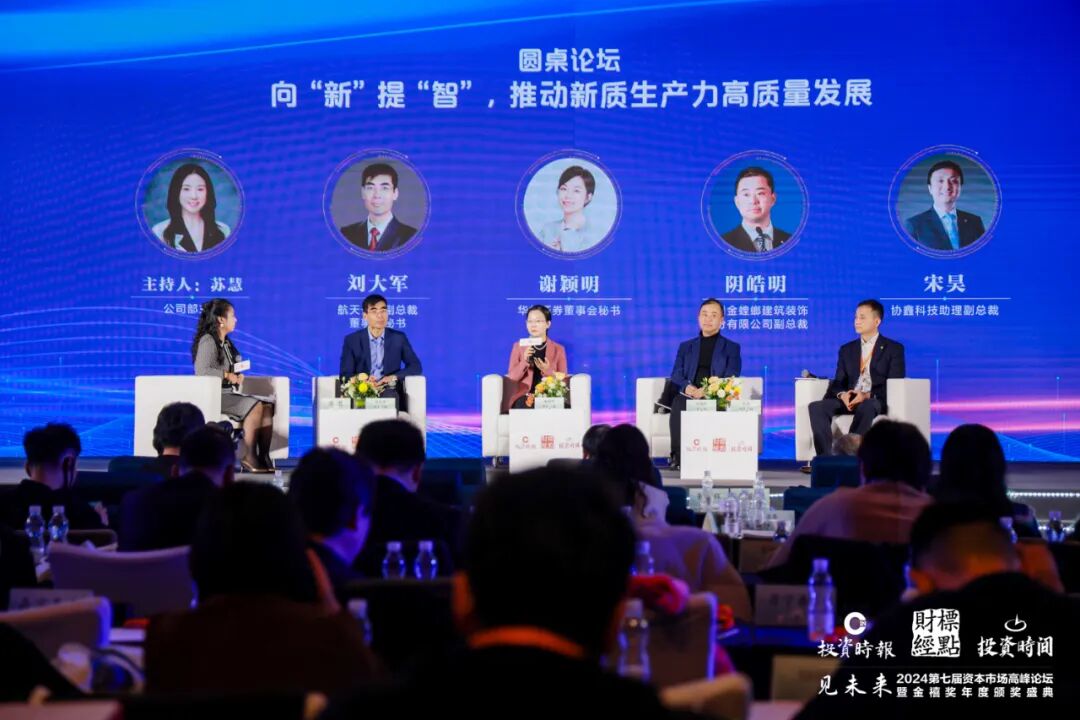 在第一场圆桌论坛中,航天长峰副总裁、董事会秘书刘大军、华林证券董事会秘书谢颖明、苏州金螳螂建筑装饰股份有限公司副总裁阴皓明、协鑫科技控股有限公司助理副总裁宋昊,就《向“新”提“智”,推动新质生产力高质量发展》话题展开讨论。