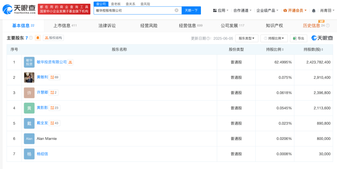 天眼查App显示,“芝华仕”品牌所属公司敏华控股有限公司成立于2010年1月,董事长为黄敏利,由敏华投资有限公司、黄敏利等共同持股。